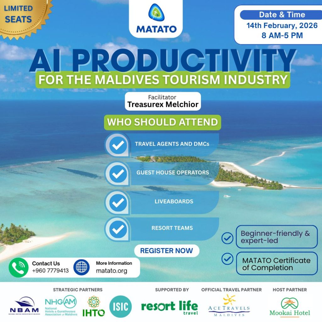 Maldives Association of Travel Agents & Tour Operators (MATATO) has announced plans to host an industry-wide AI Productivity Workshop aimed at strengthening digital skills across the Maldives’ tourism sector.