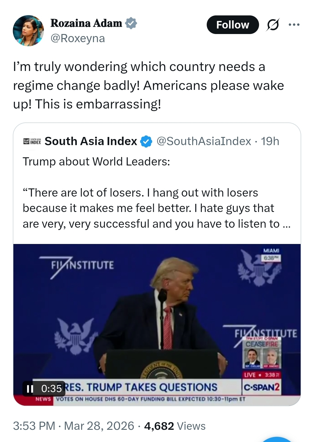 In the post shared on X, Rozaina questioned which country “needs a regime change badly,” while urging Americans to “wake up” and describing the situation as “embarrassing.” The remarks were made in response to a widely circulated video of Trump speaking about global leaders.